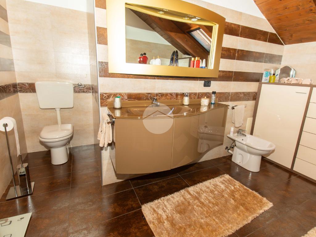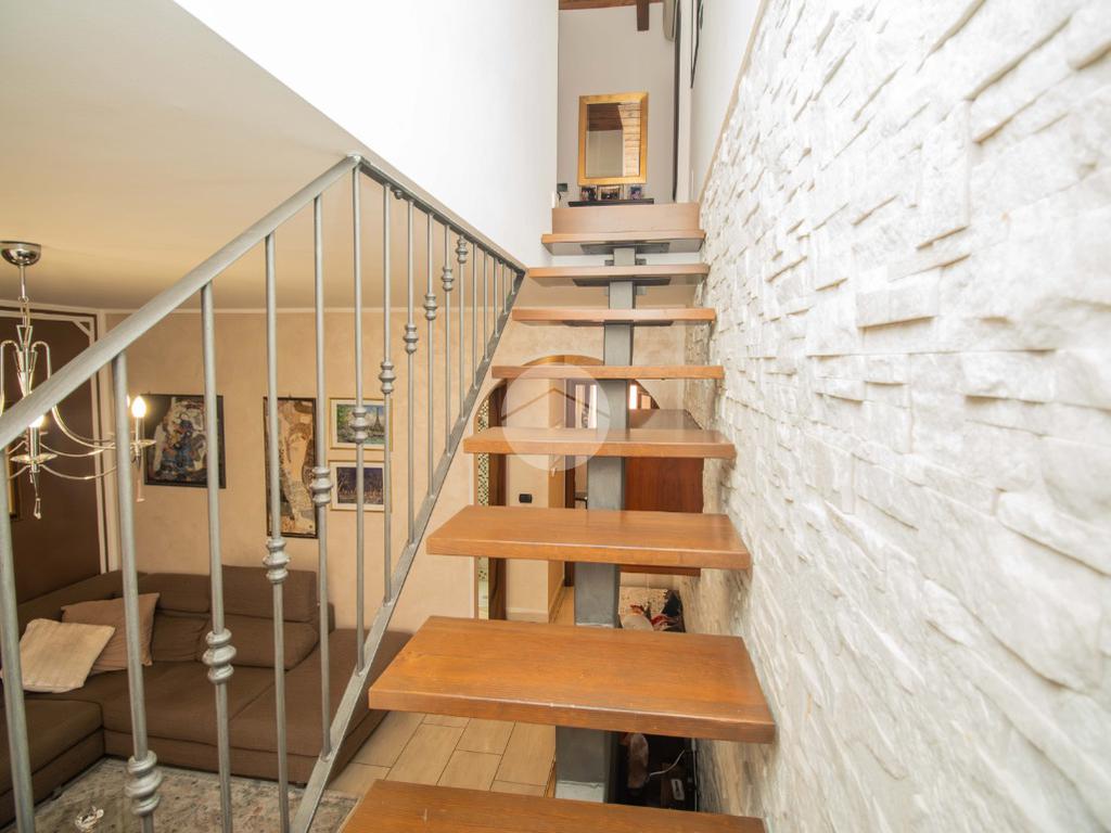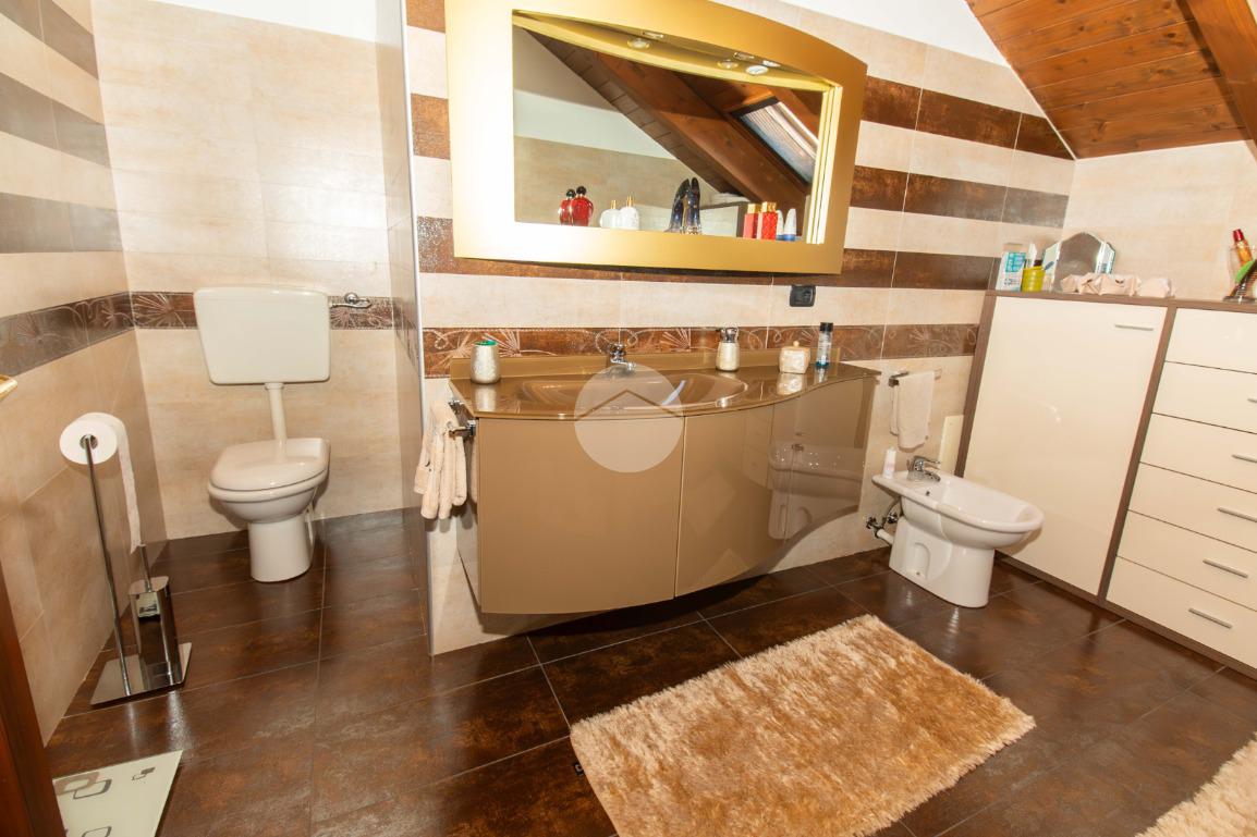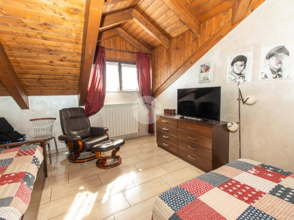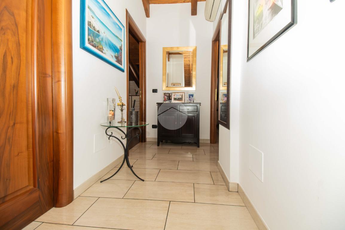 Dal soggiorno tramite comoda scala interna si ha accesso al piano superiore, in cui vi sono due ampie camere da letto, entrambe illuminate da infissi in vetrocamera in legno; e il bagno padronale, anch'esso finestrato e caratterizzato da vasca idromassaggio.
